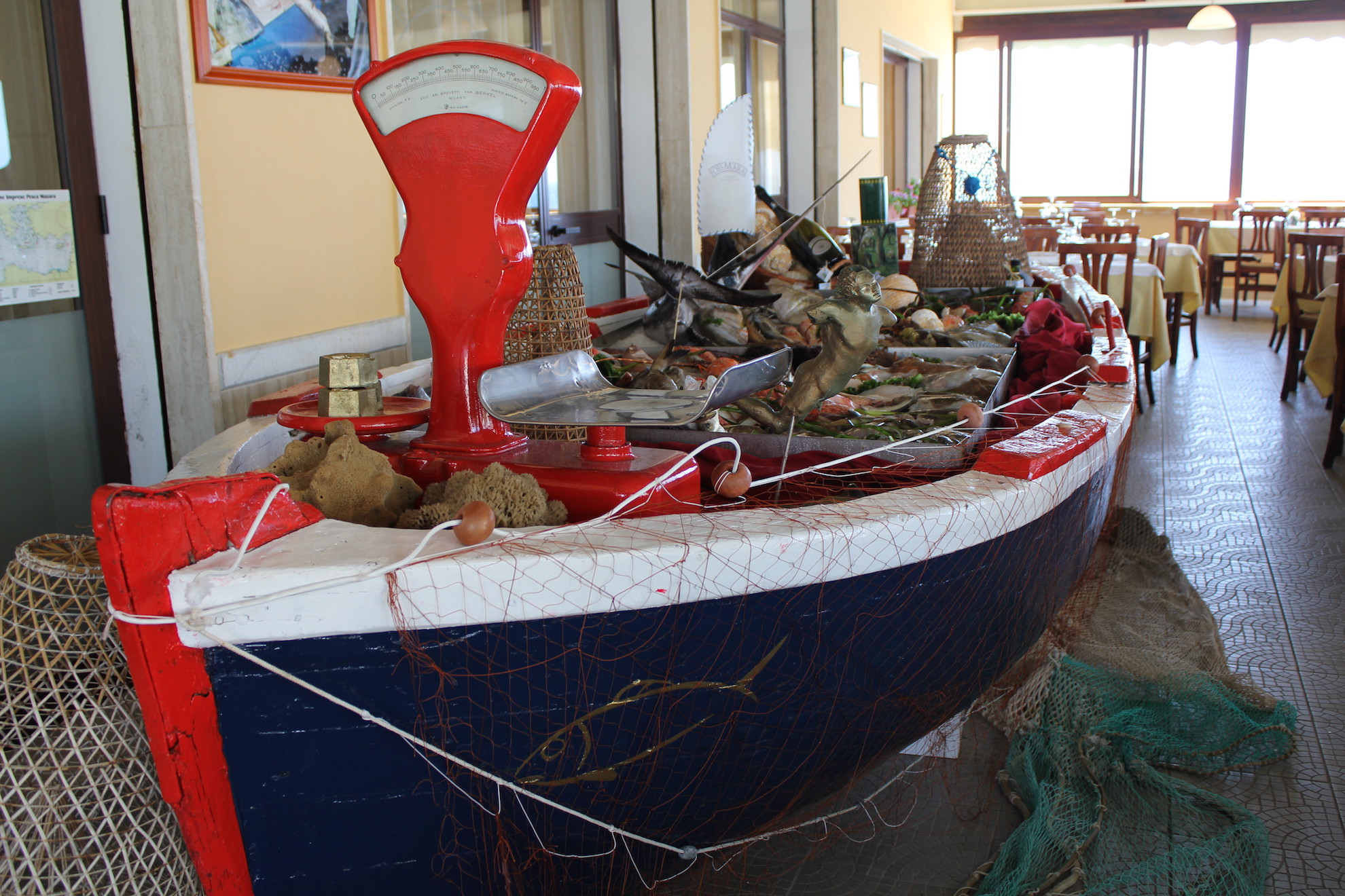 Nella veranda è presente una barca, una vera e vecchia barca recuperata dal proprietario, utilizzata per l’esposizione del pesce fresco. Qui si trova di tutto: triglie, saraghi, scorfani, calamari, totani, pesce da zuppa, gamberoni, scampi, astici e aragoste. Un vero trionfo di pesce.